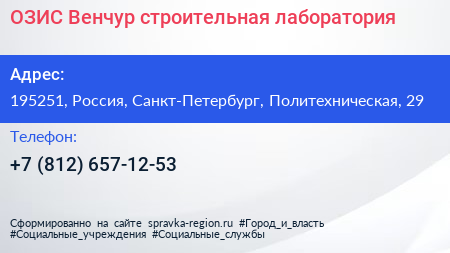 ОЗИС-Венчур, строительная лаборатория по адресу 195251, Россия, Санкт-Петербург, Политехническая, 29 в дальнейшем Организация, размещена в следующих категориях: