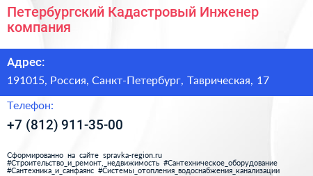 Петербургский Кадастровый Инженер, компания по адресу 191015, Россия, Санкт-Петербург, Таврическая, 17 в дальнейшем Организация, размещена в следующих категориях: