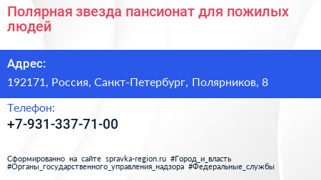 Полярная звезда, пансионат для пожилых людей по адресу 192171, Россия, Санкт-Петербург, Полярников, 8 в дальнейшем Организация, размещена в следующих категориях: