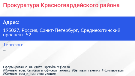 Прокуратура Красногвардейского района по адресу 195027, Россия, Санкт-Петербург, Среднеохтинский проспект, 52 в дальнейшем Организация, размещена в следующих категориях: