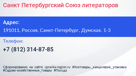 Санкт-Петербургский Союз литераторов по адресу 191011, Россия, Санкт-Петербург, Думская, 1-3 в дальнейшем Организация, размещена в следующих категориях: