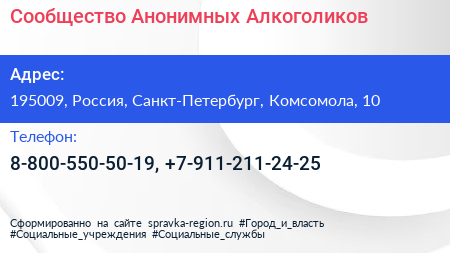 Сообщество Анонимных Алкоголиков по адресу 195009, Россия, Санкт-Петербург, Комсомола, 10 в дальнейшем Организация, размещена в следующих категориях: