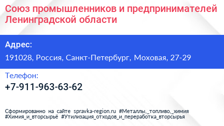 Союз промышленников и предпринимателей Ленинградской области по адресу 191028, Россия, Санкт-Петербург, Моховая, 27-29 в дальнейшем Организация, размещена в следующих категориях: