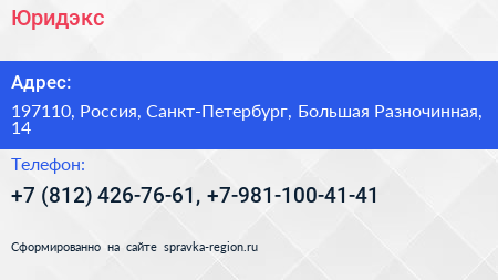 Юридэкс по адресу 197110, Россия, Санкт-Петербург, Большая Разночинная, 14 в дальнейшем Организация, размещена в следующих категориях: