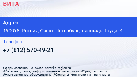 ВИТА по адресу 190098, Россия, Санкт-Петербург, площадь Труда, 4 в дальнейшем Организация, размещена в следующих категориях: