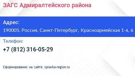 ЗАГС Адмиралтейского района по адресу 190005, Россия, Санкт-Петербург, Красноармейская 1-я, 6 в дальнейшем Организация, размещена в следующих категориях: