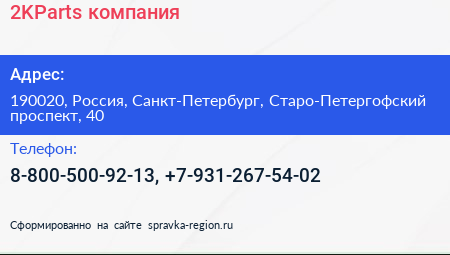 2KParts, компания по адресу 190020, Россия, Санкт-Петербург, Старо-Петергофский проспект, 40 в дальнейшем Организация, размещена в следующих категориях: