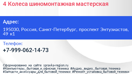 4 Колеса, шиномонтажная мастерская по адресу 195030, Россия, Санкт-Петербург, проспект Энтузиастов, 49 к1 в дальнейшем Организация, размещена в следующих категориях: