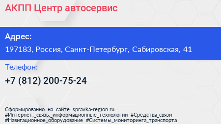 АКПП Центр, автосервис по адресу 197183, Россия, Санкт-Петербург, Сабировская, 41 в дальнейшем Организация, размещена в следующих категориях: