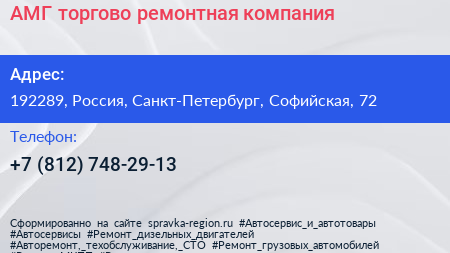 АМГ, торгово-ремонтная компания по адресу 192289, Россия, Санкт-Петербург, Софийская, 72 в дальнейшем Организация, размещена в следующих категориях: