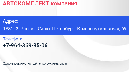 АВТОКОМПЛЕКТ, компания по адресу 198152, Россия, Санкт-Петербург, Краснопутиловская, 69 в дальнейшем Организация, размещена в следующих категориях: