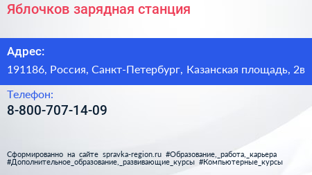 Яблочков, зарядная станция по адресу 191186, Россия, Санкт-Петербург, Казанская площадь, 2в в дальнейшем Организация, размещена в следующих категориях: