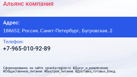 Альянс, компания по адресу 188652, Россия, Санкт-Петербург, Бугровская, 2 в дальнейшем Организация, размещена в следующих категориях: