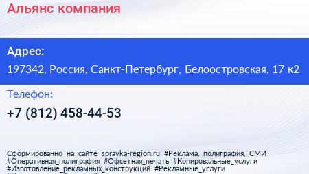 Альянс, компания по адресу 197342, Россия, Санкт-Петербург, Белоостровская, 17 к2 в дальнейшем Организация, размещена в следующих категориях: