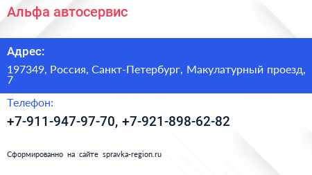 Альфа, автосервис по адресу 197349, Россия, Санкт-Петербург, Макулатурный проезд, 7 в дальнейшем Организация, размещена в следующих категориях: