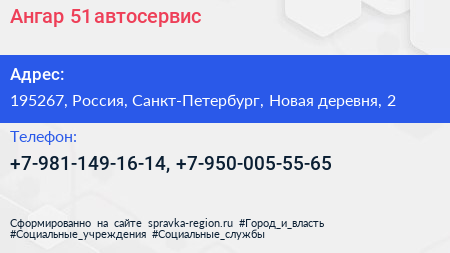 Ангар 51, автосервис по адресу 195267, Россия, Санкт-Петербург, Новая деревня, 2 в дальнейшем Организация, размещена в следующих категориях: