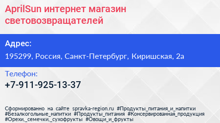 AprilSun, интернет-магазин световозвращателей по адресу 195299, Россия, Санкт-Петербург, Киришская, 2а в дальнейшем Организация, размещена в следующих категориях: