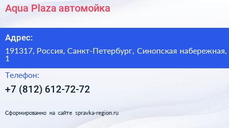 Aqua-Plaza, автомойка по адресу 191317, Россия, Санкт-Петербург, Синопская набережная, 1 в дальнейшем Организация, размещена в следующих категориях: