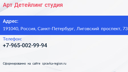 Арт Детейлинг, студия по адресу 191040, Россия, Санкт-Петербург, Лиговский проспект, 73 в дальнейшем Организация, размещена в следующих категориях: