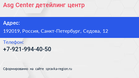 Asg Center, детейлинг-центр по адресу 192019, Россия, Санкт-Петербург, Седова, 12 в дальнейшем Организация, размещена в следующих категориях:
