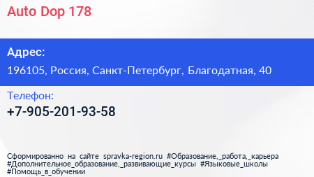 Auto Dop 178 по адресу 196105, Россия, Санкт-Петербург, Благодатная, 40 в дальнейшем Организация, размещена в следующих категориях: