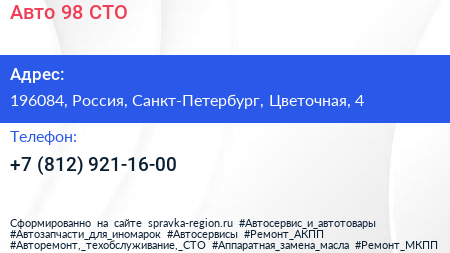 Авто-98, СТО по адресу 196084, Россия, Санкт-Петербург, Цветочная, 4 в дальнейшем Организация, размещена в следующих категориях: