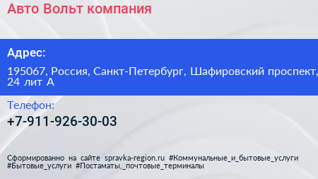 Авто Вольт, компания по адресу 195067, Россия, Санкт-Петербург, Шафировский проспект, 24 лит А в дальнейшем Организация, размещена в следующих категориях: