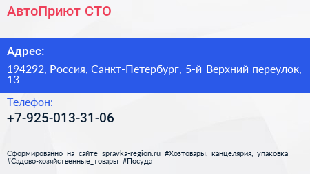 АвтоПриют, СТО по адресу 194292, Россия, Санкт-Петербург, 5-й Верхний переулок, 13 в дальнейшем Организация, размещена в следующих категориях:
