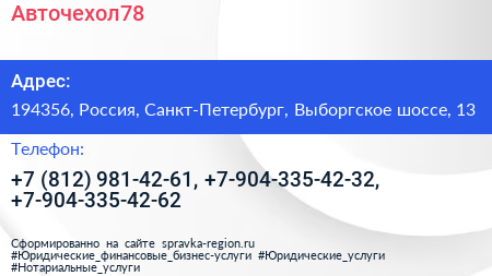 Авточехол78 по адресу 194356, Россия, Санкт-Петербург, Выборгское шоссе, 13 в дальнейшем Организация, размещена в следующих категориях: