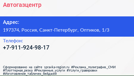 Автогазцентр по адресу 197374, Россия, Санкт-Петербург, Оптиков, 1/3 в дальнейшем Организация, размещена в следующих категориях: