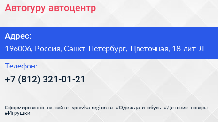 Автогуру, автоцентр по адресу 196006, Россия, Санкт-Петербург, Цветочная, 18 лит Л в дальнейшем Организация, размещена в следующих категориях: