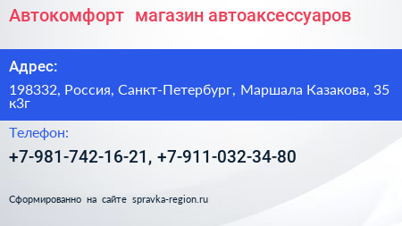 Автокомфорт+, магазин автоаксессуаров по адресу 198332, Россия, Санкт-Петербург, Маршала Казакова, 35 к3г в дальнейшем Организация, размещена в следующих категориях: