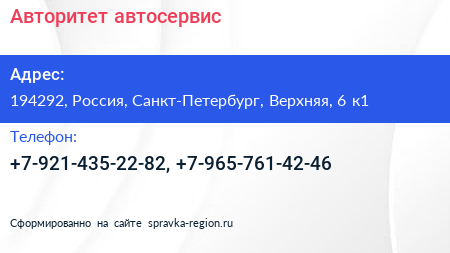 Авторитет, автосервис по адресу 194292, Россия, Санкт-Петербург, Верхняя, 6 к1 в дальнейшем Организация, размещена в следующих категориях: