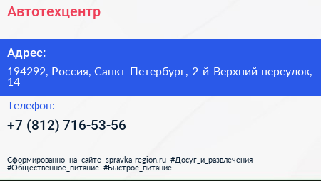 Автотехцентр по адресу 194292, Россия, Санкт-Петербург, 2-й Верхний переулок, 14 в дальнейшем Организация, размещена в следующих категориях: