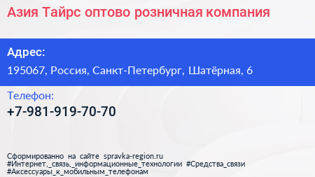 Азия Тайрс, оптово-розничная компания по адресу 195067, Россия, Санкт-Петербург, Шатёрная, 6 в дальнейшем Организация, размещена в следующих категориях:
