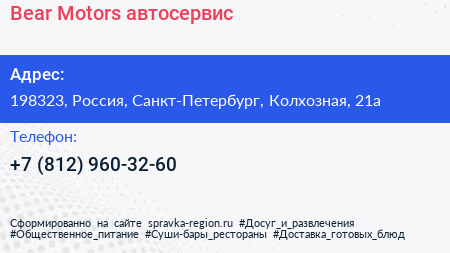 Bear Motors, автосервис по адресу 198323, Россия, Санкт-Петербург, Колхозная, 21а в дальнейшем Организация, размещена в следующих категориях: