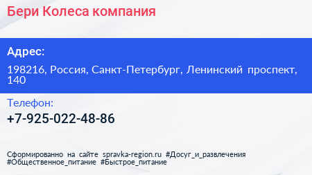 Бери Колеса, компания по адресу 198216, Россия, Санкт-Петербург, Ленинский проспект, 140 в дальнейшем Организация, размещена в следующих категориях: