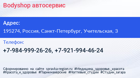 Bodyshop, автосервис по адресу 195274, Россия, Санкт-Петербург, Учительская, 3 в дальнейшем Организация, размещена в следующих категориях: