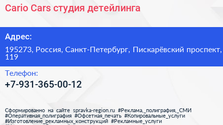 Cario Cars, студия детейлинга по адресу 195273, Россия, Санкт-Петербург, Пискарёвский проспект, 119 в дальнейшем Организация, размещена в следующих категориях:
