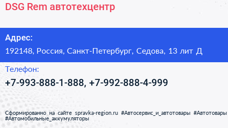 DSG-Rem, автотехцентр по адресу 192148, Россия, Санкт-Петербург, Седова, 13 лит Д в дальнейшем Организация, размещена в следующих категориях: