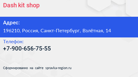 Dash kit shop по адресу 196210, Россия, Санкт-Петербург, Взлётная, 14 в дальнейшем Организация, размещена в следующих категориях: