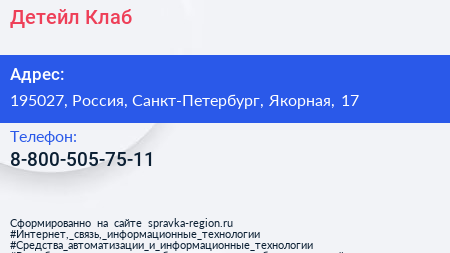 Детейл Клаб по адресу 195027, Россия, Санкт-Петербург, Якорная, 17 в дальнейшем Организация, размещена в следующих категориях:
