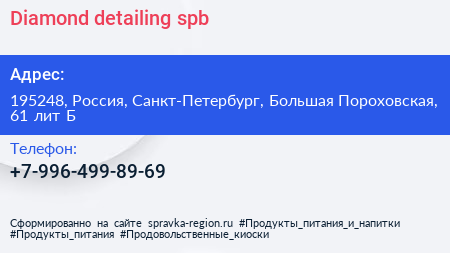 Diamond detailing spb по адресу 195248, Россия, Санкт-Петербург, Большая Пороховская, 61 лит Б в дальнейшем Организация, размещена в следующих категориях: