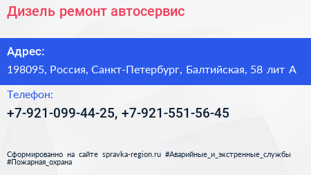 Дизель-ремонт, автосервис по адресу 198095, Россия, Санкт-Петербург, Балтийская, 58 лит А в дальнейшем Организация, размещена в следующих категориях: