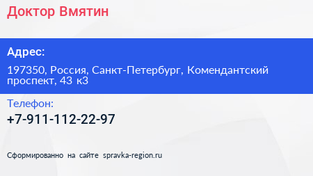 Доктор Вмятин по адресу 197350, Россия, Санкт-Петербург, Комендантский проспект, 43 к3 в дальнейшем Организация, размещена в следующих категориях: