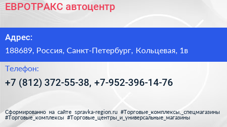 ЕВРОТРАКС, автоцентр по адресу 188689, Россия, Санкт-Петербург, Кольцевая, 1в в дальнейшем Организация, размещена в следующих категориях: