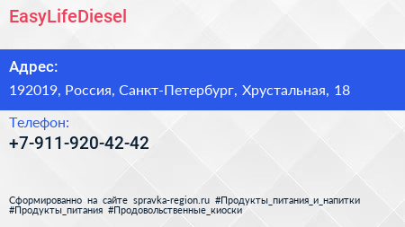 EasyLifeDiesel по адресу 192019, Россия, Санкт-Петербург, Хрустальная, 18 в дальнейшем Организация, размещена в следующих категориях: