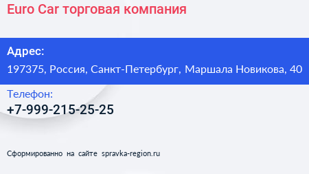 Euro Car, торговая компания по адресу 197375, Россия, Санкт-Петербург, Маршала Новикова, 40 в дальнейшем Организация, размещена в следующих категориях:
