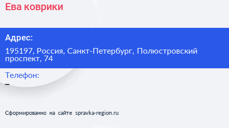 Ева-коврики по адресу 195197, Россия, Санкт-Петербург, Полюстровский проспект, 74 в дальнейшем Организация, размещена в следующих категориях: