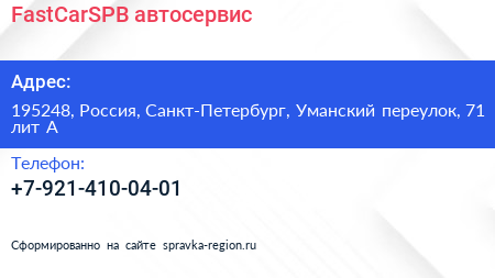 FastCarSPB, автосервис по адресу 195248, Россия, Санкт-Петербург, Уманский переулок, 71 лит А в дальнейшем Организация, размещена в следующих категориях: